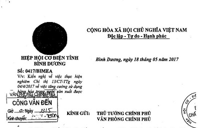 hiệp hội cơ điện bình dương kiến nghị về việc thực hiện nghiêm chỉ thị số 13/ct-ttg ngày 4/7/2017 của thủ tướng chính phủ về tăng cường sử dụng hàng hóa trong nước sản xuất trong công tác đấu thầu.