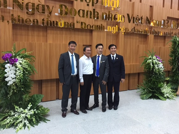 Lãnh đạo tỉnh Bình Dương tặng hoa và trao biểu trưng cho doanh nghiệp, doanh nhân tiêu biểu (ÔngTrần Thành Trọng- TGĐ Công ty CP Sáng Ban Mai đứng thứ hai hàng thứ hai từ bên phải)