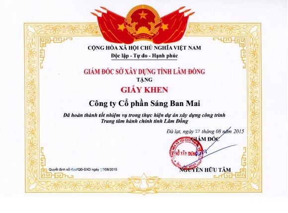 Chính vì vậy SBM được Giám đốc Sở Xây Dựng tỉnh Lâm Đồng tặng giấy khen vì đã hoàn thành tốt nhiệm vụ trong thực hiện dự án xây dựng công trình Trung tâm hành chính tỉnh Lâm Đồng.