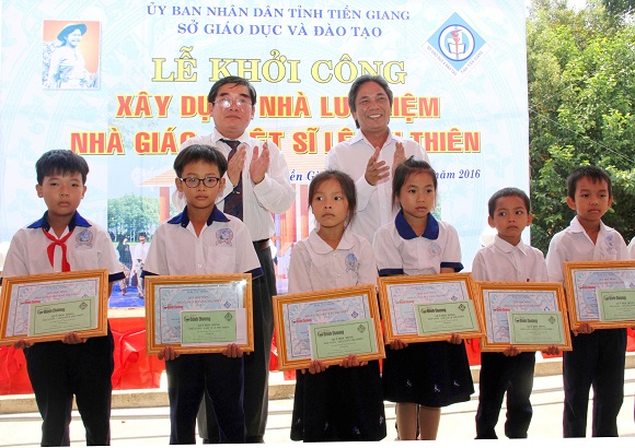 Dịp này, Sở Giáo dục và Đào tạo tỉnh Tiền Giang phối hợp cùng Báo Bình Dương ra mắt Quỹ học bổng mang tên nhà giáo - Liệt sĩ Lê Thị Thiên. Quỹ học bổng nhằm giúp đỡ cho các em học sinh vượt khó của các trường TH, THCS thuộc xã Mỹ Phước Tây tỉnh Tiền Giang. Tại buổi ra mắt quỹ học bổng, đại diện Công ty Cổ phần Sáng Ban Mai anh Bùi Ngọc Anh đã trao tặng số tiền 20 triệu đồng cho quỹ học bổng mang tên nhà giáo - Liệt sĩ Lê Thị Thiên.