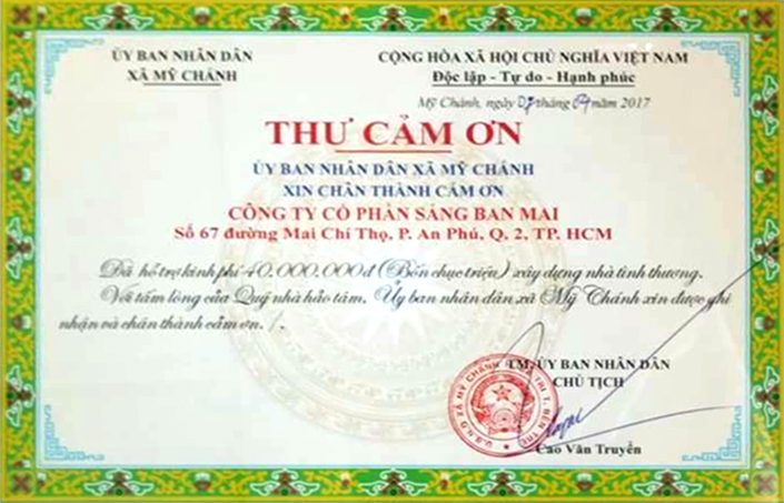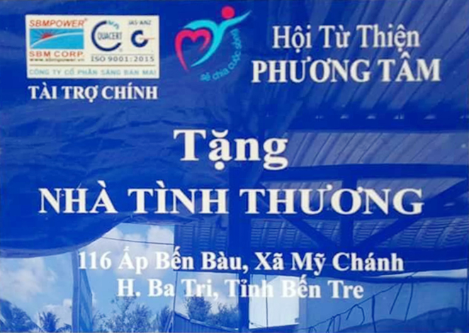 Dịp này SBM đã hỗ trợ kinh phí 40 triệu đồng phối hợp cùng với Hội từ thiện Phương Tâm cùng tổ chức lễ trao tặng nhà. Buổi lễ trao tặng nhà được diễn ra trong không khí trang trọng cùng sự có mặt của đại diện UBND xã Mỹ Chánh, ông Nguyễn Văn Lai cùng đại các bên và Ủy ban Nhân dân xã Mỹ Chánh cũng đã gửi thư cám ơn đến SBM về sự đóng góp xây dựng nhà tình thương.