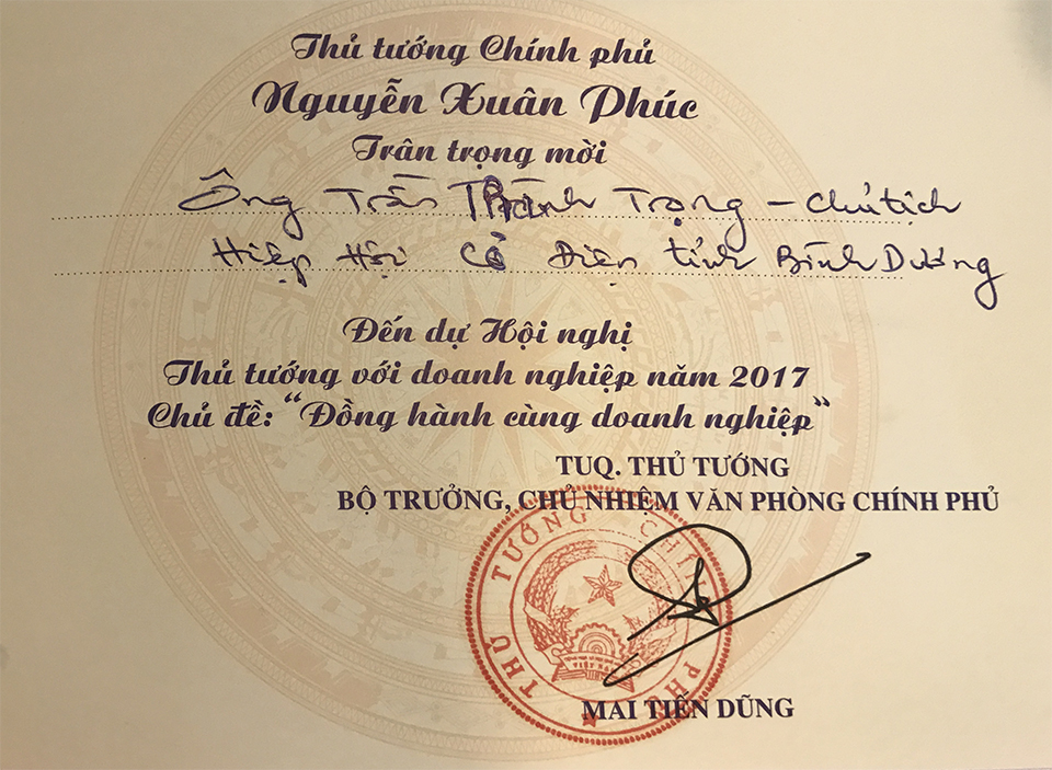 Hôm nay 17/5/207, TGĐ SBM/ CT Hiệp hội Cơ Điện tỉnh Bình Dương Trần Thành Trọng đã tham dự HỘI NGHỊ THỦ TƯỚNG CHÍNH PHỦ VỚI DOANH NGHIỆP với chủ đề " ĐỒNG HÀNH CÙNG DOANH NGHIỆP".