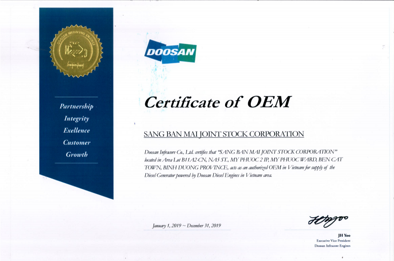 Trong tình hình cạnh tranh gay gắt với các nguồn sản phẩm bị làm giả, làm nhái nhãn hiệu DOOSAN tại TRUNG QUỐC thì việc cấp chứng nhận OEM của Doosan cho SBM một lần nữa chứng minh cho uy tín và chất lượng của sản phẩm máy phát điện của SBM.