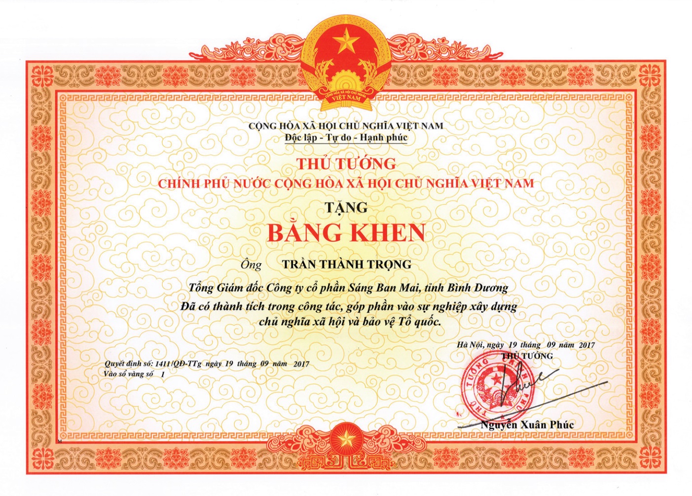 Thừa uỷ quyền của Thủ tướng Chính phủ Nguyễn Xuân Phúc, Chủ tịch UBND tỉnh Bình Dương đã trao Bằng khen của Thủ tướng Chính phủ cho Ông Trần Thành Trọng- TGĐ Công ty CP Sáng Ban Mai.