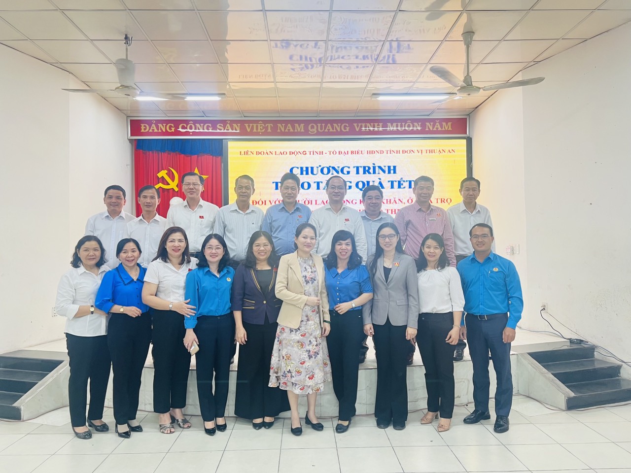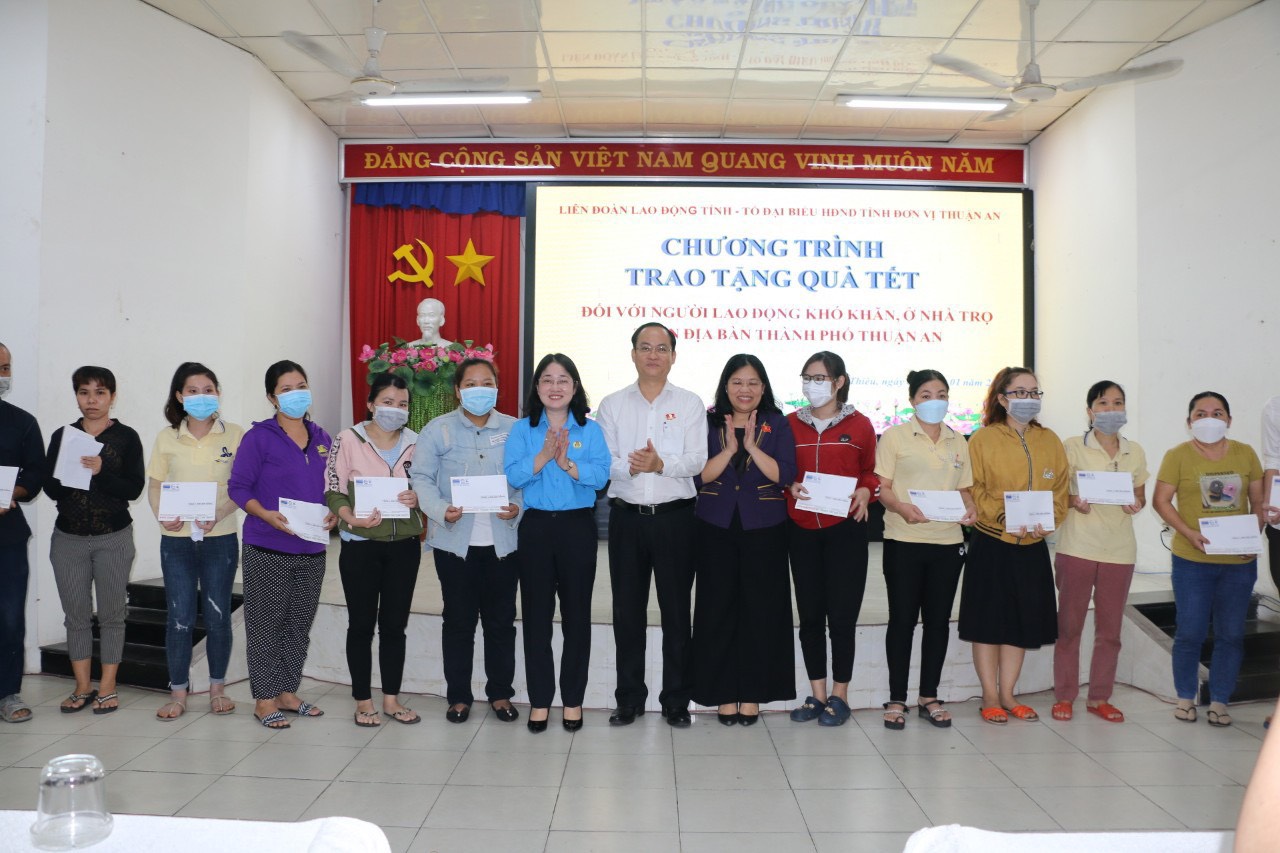 Chiều ngày 05/01/2023, LĐLĐ tỉnh phối hợp với Hội đồng Nhân dân (HĐND) tỉnh (Tổ đại biểu HĐND đơn vị Thuận An) đã đến thăm, tặng quà Tết cho NLĐ khó khăn tại một số khu nhà trọ trên địa bàn thành phố Thuận An.