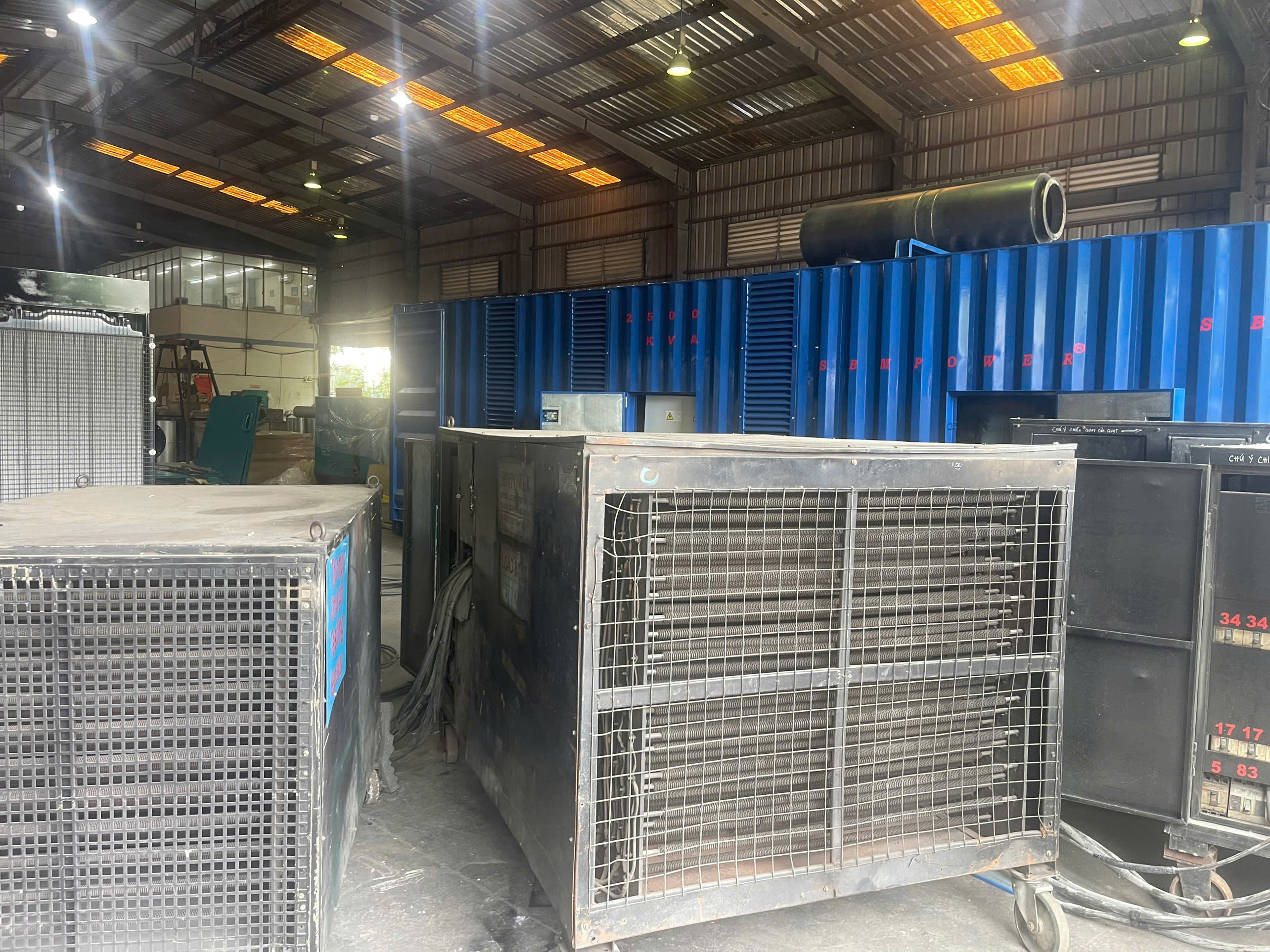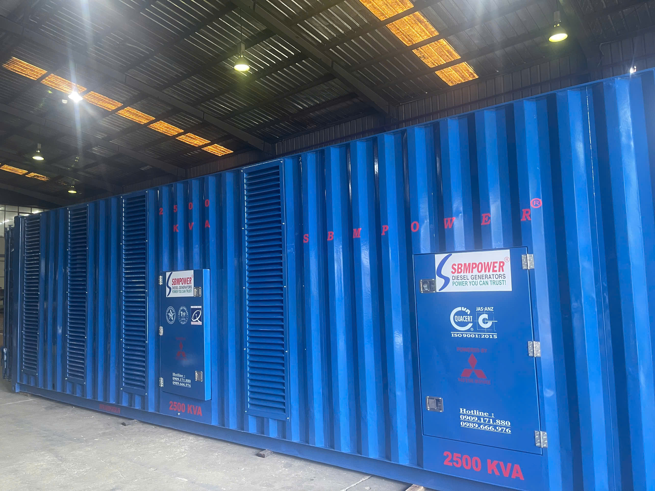 Tổ hợp máy phát điện 2500KVA được vận hành bằng động cơ MITSUBISHI , đầu phát điện NIDEC-LEROYSOMER và công nghệ điều khiển DEEPSEA ( UK), tủ ACB 4000A và hệ thống cấp dầu 5000l. Tất cả được SBM tích hợp trong container 40F có trang bị hệ thống giảm âm đặc biệt.